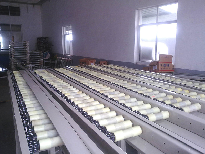 鋁合金發(fā)動機(jī)蓋缸雙鏈傳動積放式動力輥筒輸送線(輥筒采用表面包聚氨酯形式)